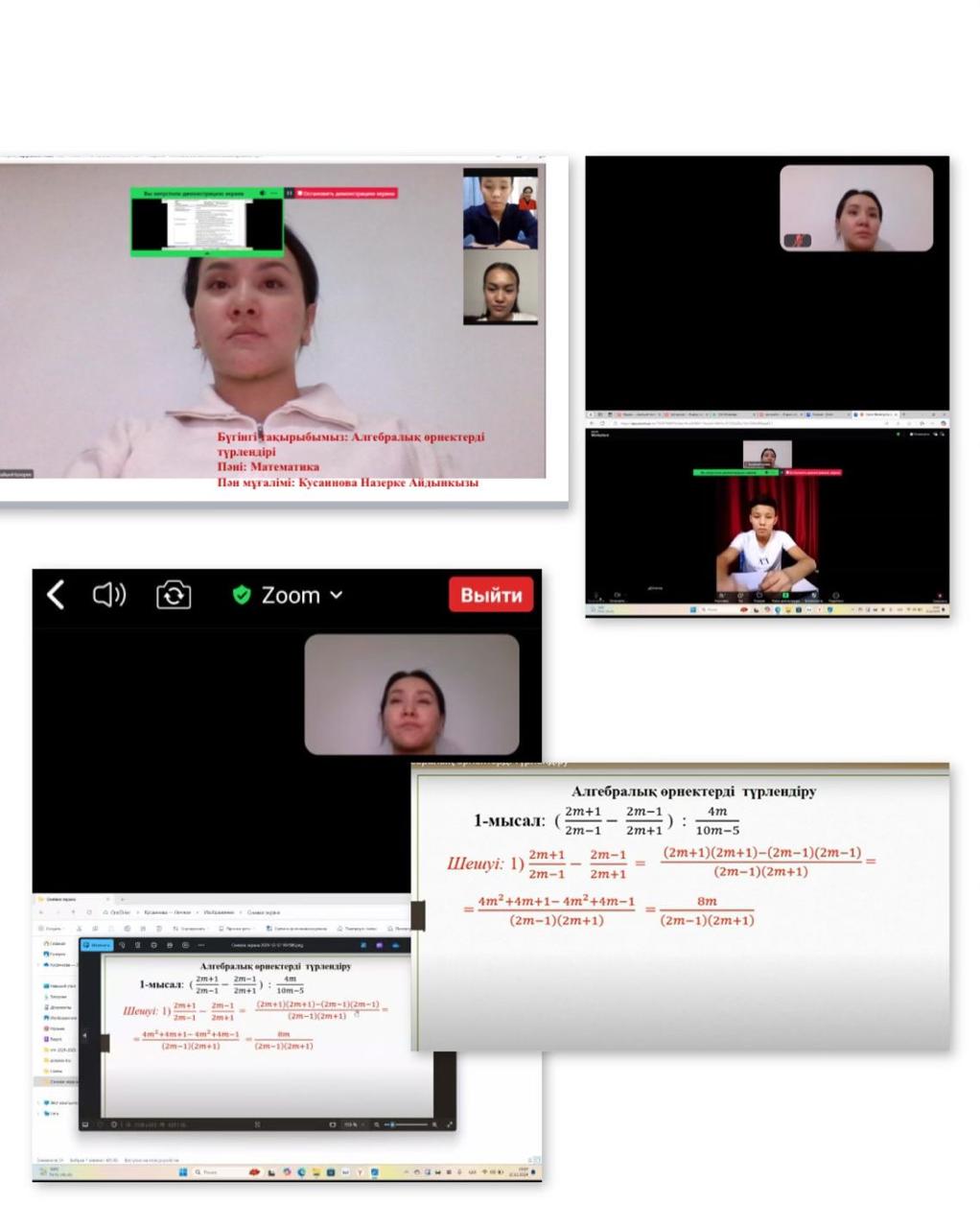 2024 жылдың 12 желтоқсан күні «Цифрлық ұстаз” жобасы аясында “Алгебралық өрнектерді түрлендіру” тақырыбына зум платформасы арқылы онлайн сабақ өткізілді.