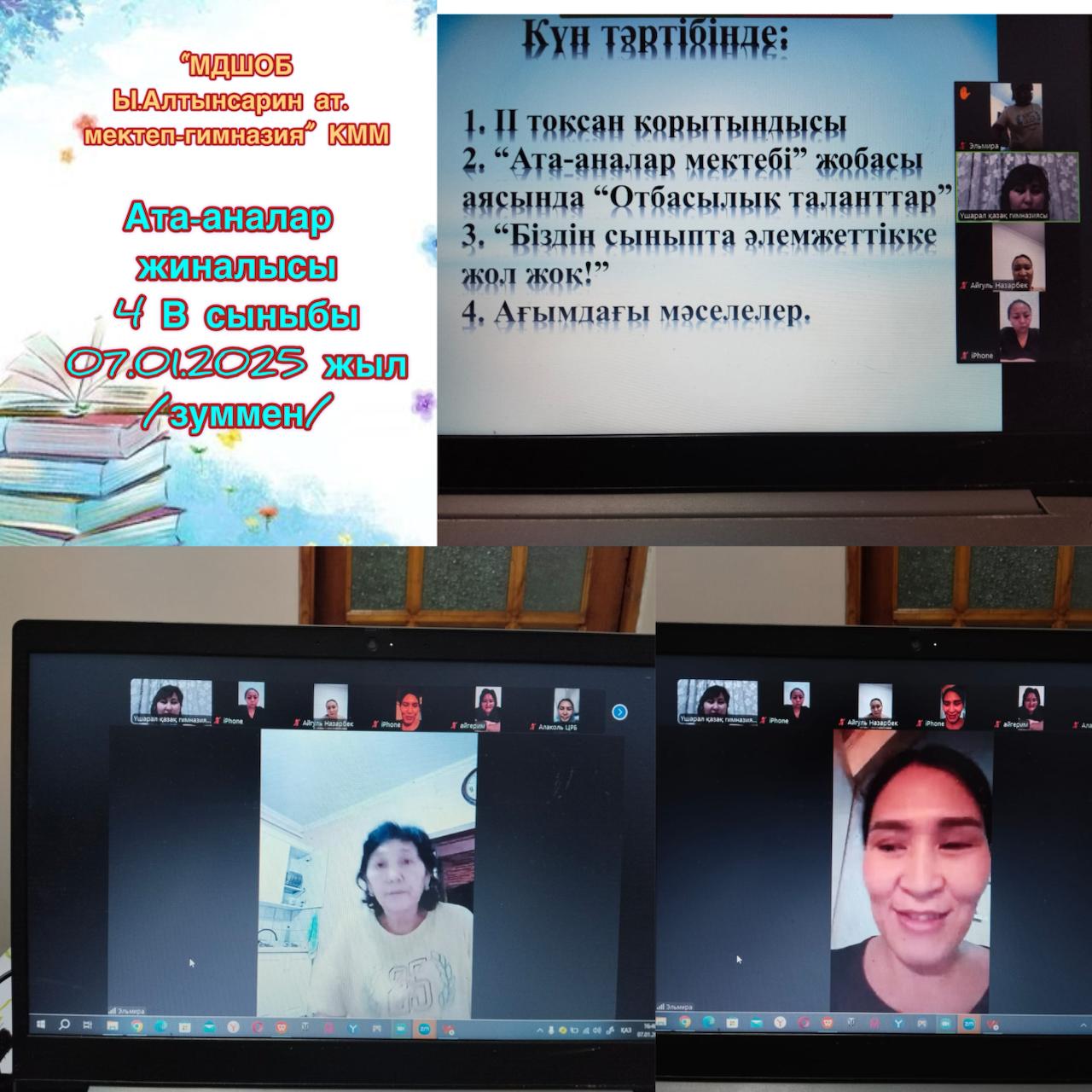 2025 жылдың 7 қаңтар күні «Ыбырай Алтынсарин атындағы мектеп-гимназия» КММ-де 4 В сыныбы ата-аналарымен жиналыс өтті. Жиналыс барысында келесі мәселелер талқыланды:
