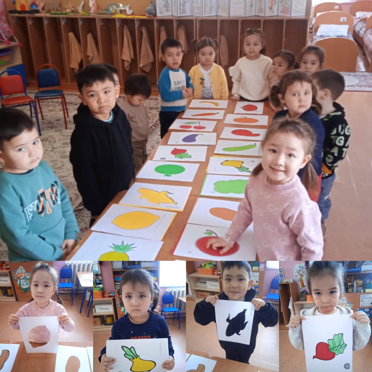 Мақсаты:Балалардың көкөністер мен жемістердің түстерін ажырату қабілетін дамыту,зейін мен есте сақтау қабілетін нығайту,сондай-ақ түстер мен табиғи өнімдер туралы білімдерін кеңейту.
