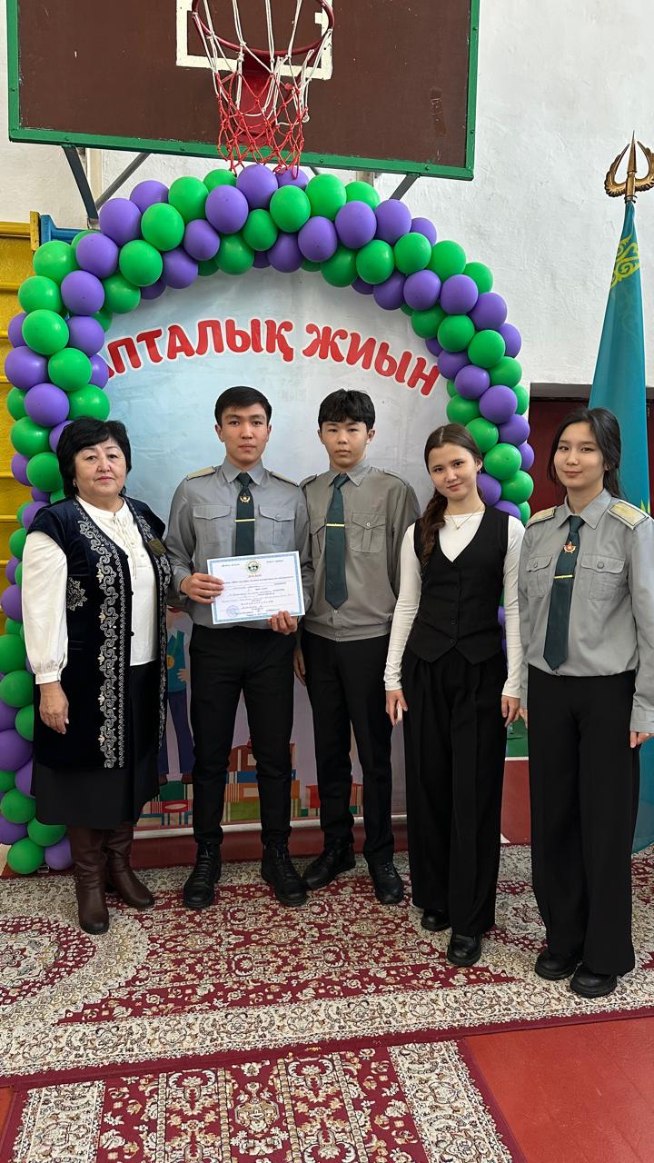 Аудандық «Әбіш оқулары» ғылыми шығармашылық конкурсының сахналық қойылым бағытында 3 орын алған Ыбырай Алтынсарин атындағы мектеп-гимназияның оқушылары Исақан Ақнұр, Бөлеш Әли, Амангелді Еркежан, Ахатай Бекжан, Қыдырхан Бақберген.