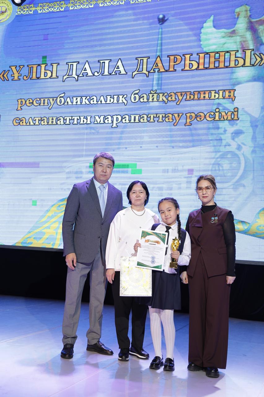 «Мектепке дейінгі шағын орталығы бар Ыбырай Алтынсарин атындағы мектеп-гимназия»КММ.Ұлы ағартушы ,хакім Абай Құнанбайұлының 180 жылдық мерейтойына орай ақынның шығармашылығын дәріптеу,жас ұрпақтың әдебиетке деген сүйіспеншілігін арттыру және ұлттық рухани құндылықтарды насихаттау мақсатында өткізілген «Ұлы дала дарыны»атты республикалық эссе байқауында оқушысымен қатысып,жоғары жетістікке қол жеткізуіне жетекшілік жасап жеңімпаз атанған Делегеева Жұлдыз Арынтаевна .