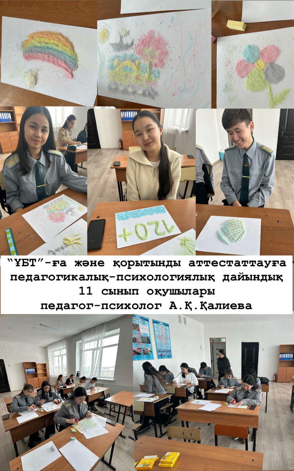 «Мектепке дейінгі шағын орталығы бар Ыбырай Алтынсарин атындағы мектеп-гимназия»КММ.Ағымдағы жылдың 4 тоқсанында жоспарға сәйкес, мектеп бітіруші түлектермен Қорытынды аттестаттауға, ҰБТ-ге педагогикалық-психологиялық дайындық мақсатында, тақырып бойынша дәрістер өткізіліп, тұзды акварель және т.б. арт-терапиялар, тақырыптық әңгімелесулер, педагогикалық-психологиялық тренингтер жүргізілді.