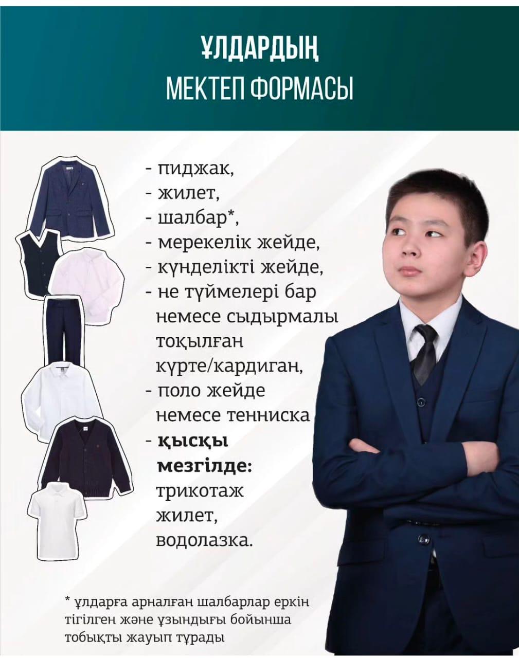 Мектеп формасы – оқушының мектептегі тәртібі мен сырт келбетінің талапқа сай болуын қамтамасыз ететін маңызды элемент. Барлық оқушылар бірыңғай мектеп формасын киюге міндетті.