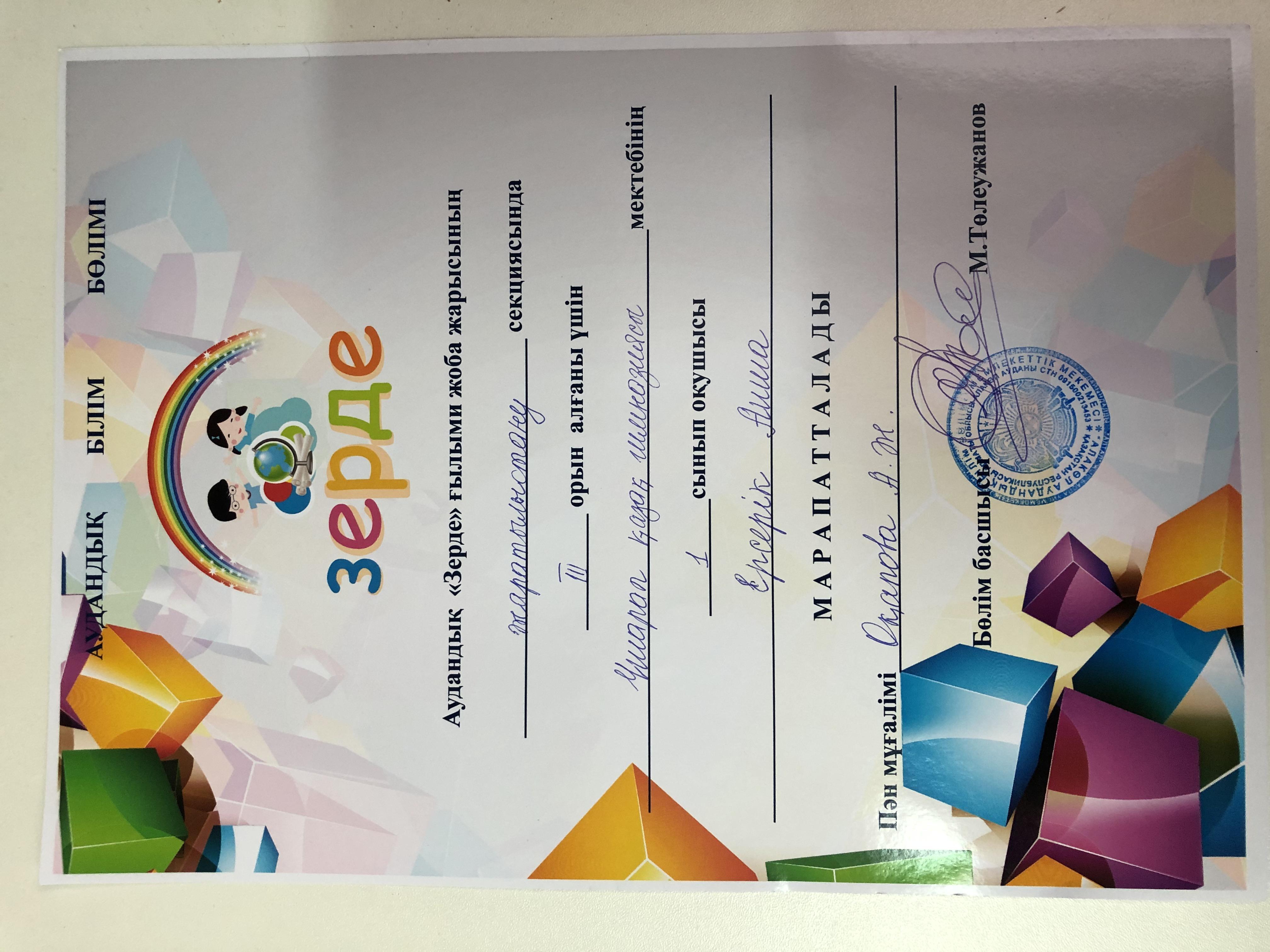 Зерде аудандық ғылыми жоба байқауы Ерсерік Аиша ІІІ-орын. Мұғалімі Оқапова Айсұлу Жеңісқызы » «Жетісу облысы білім басқармасының Алакөл ауданы бойынша білім бөлімі» мемлекеттік мекемесінің «Үшарал қазақ гимназиясы мектеп жасына дейінгі шағын орталығы бар» коммуналдық мемлекеттік мекемесі