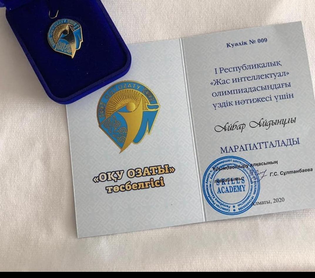30 декабрь 2020 0 1 2 3 4 5 Үздік нәтиже Республикалық "Жас интеллектуал" олимпиадасында үздік нәтиже көрсетіп, "Оқу озаты" төсбелгісімен марапатталған Айдынұлы Айбарды құттықтаймыз!
