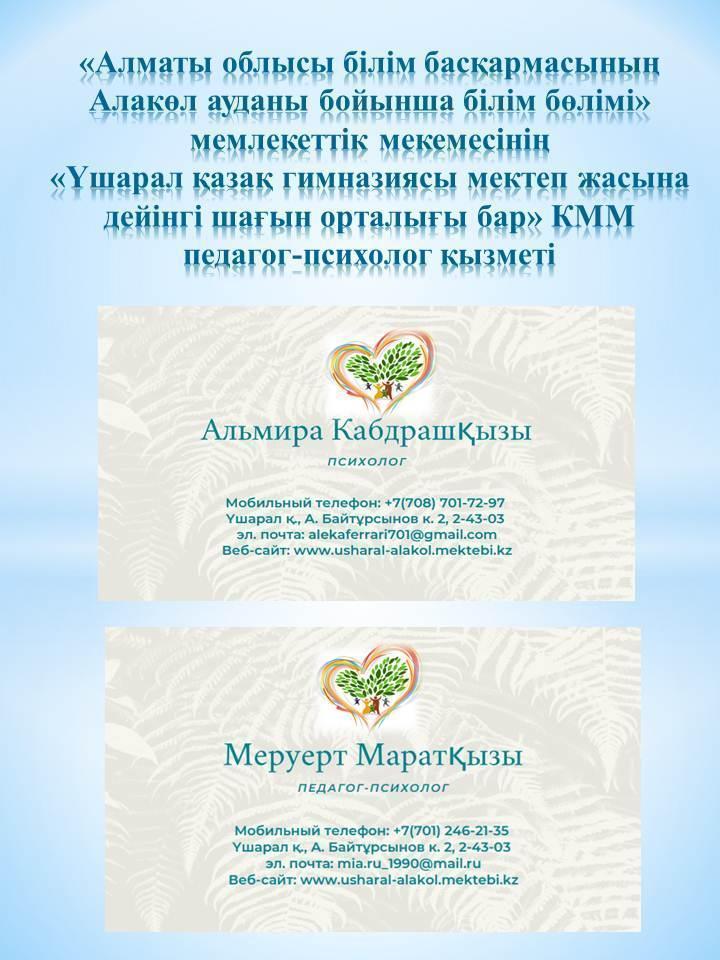 педагог-психолог қызметі » «Жетісу облысы білім басқармасының Алакөл ауданы бойынша білім бөлімі» мемлекеттік мекемесінің «Үшарал қазақ гимназиясы мектеп жасына дейінгі шағын орталығы бар» коммуналдық мемлекеттік мекемесі