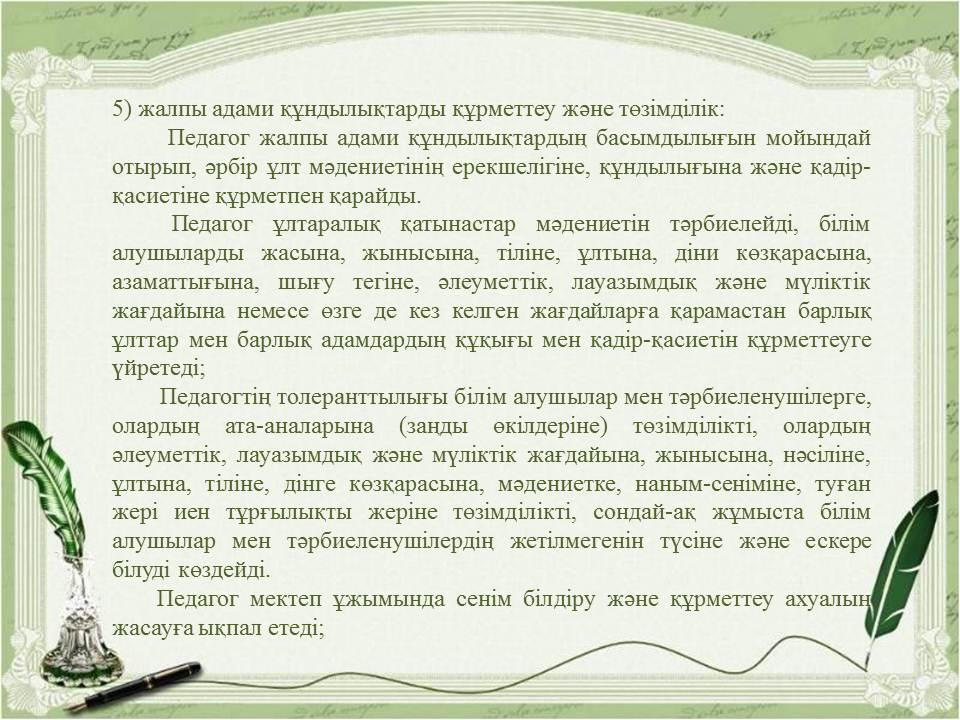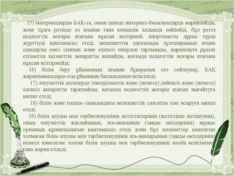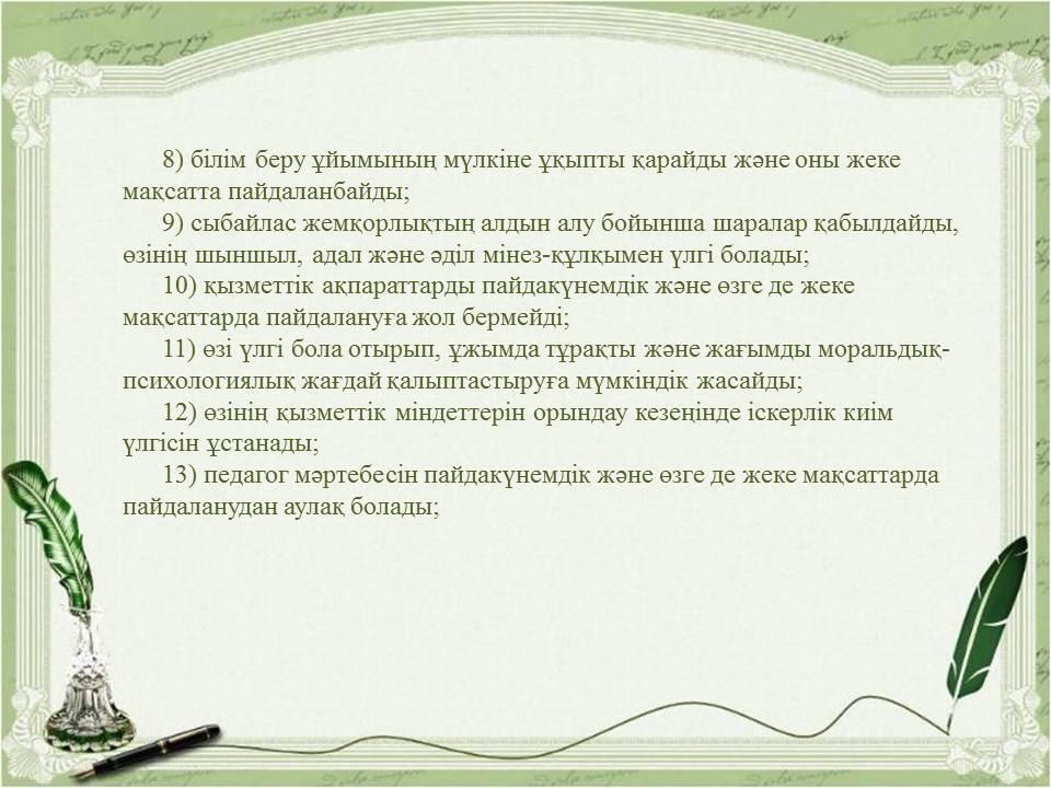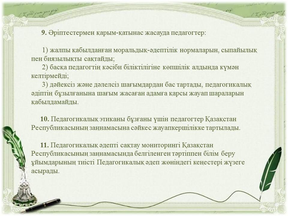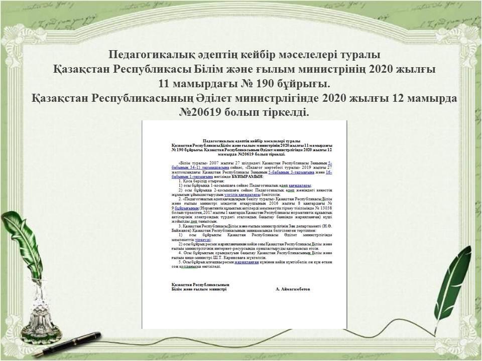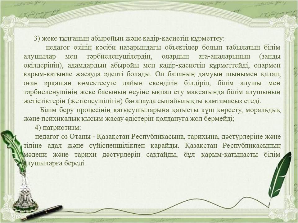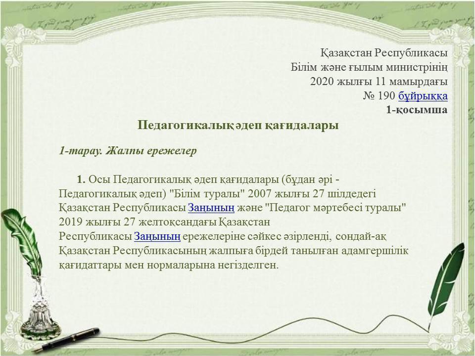 Педагогикалық әдептің кейбір мәселелері туралыҚазақстан Республикасы Бі » «Жетісу облысы білім басқармасының Алакөл ауданы бойынша білім бөлімі» мемлекеттік мекемесінің «Үшарал қазақ гимназиясы мектеп жасына дейінгі шағын орталығы бар» коммуналдық мемлекеттік мекемесі
