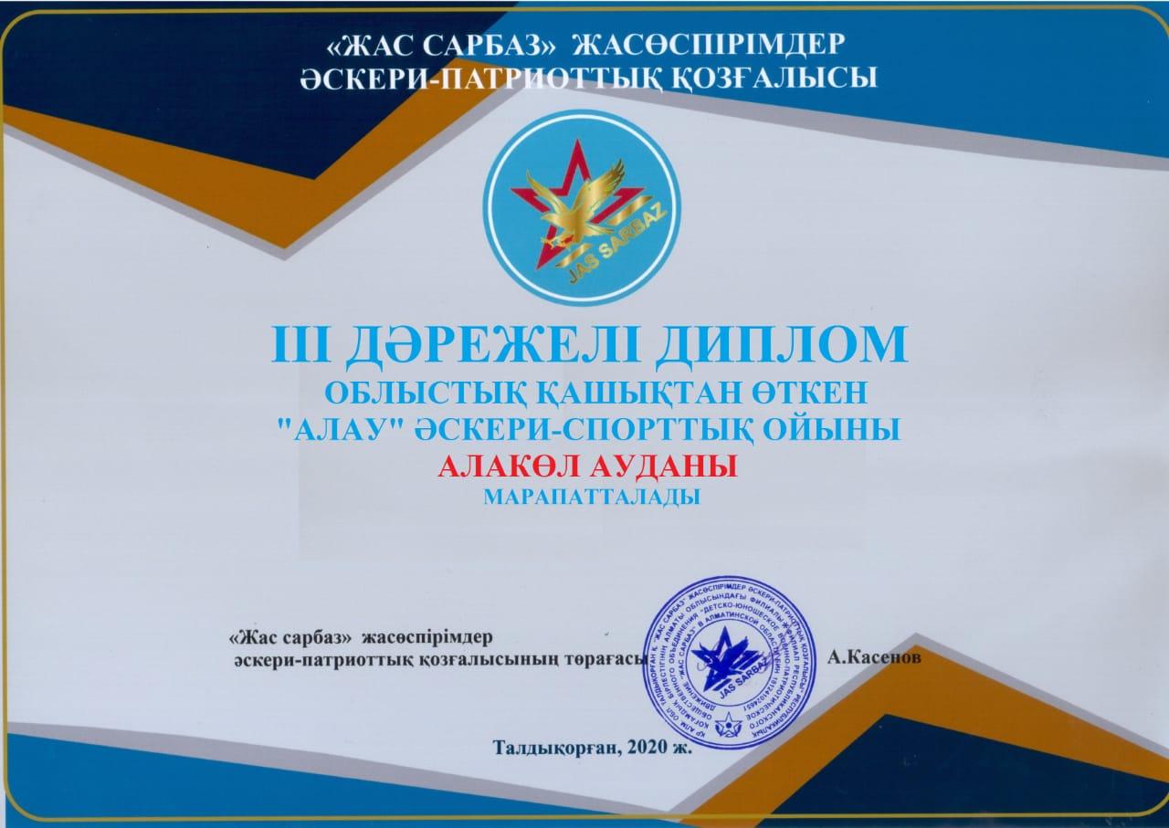 Алау әскери спорттық ойыны 3 дәрежелі диплом » «Жетісу облысы білім басқармасының Алакөл ауданы бойынша білім бөлімі» мемлекеттік мекемесінің «Үшарал қазақ гимназиясы мектеп жасына дейінгі шағын орталығы бар» коммуналдық мемлекеттік мекемесі