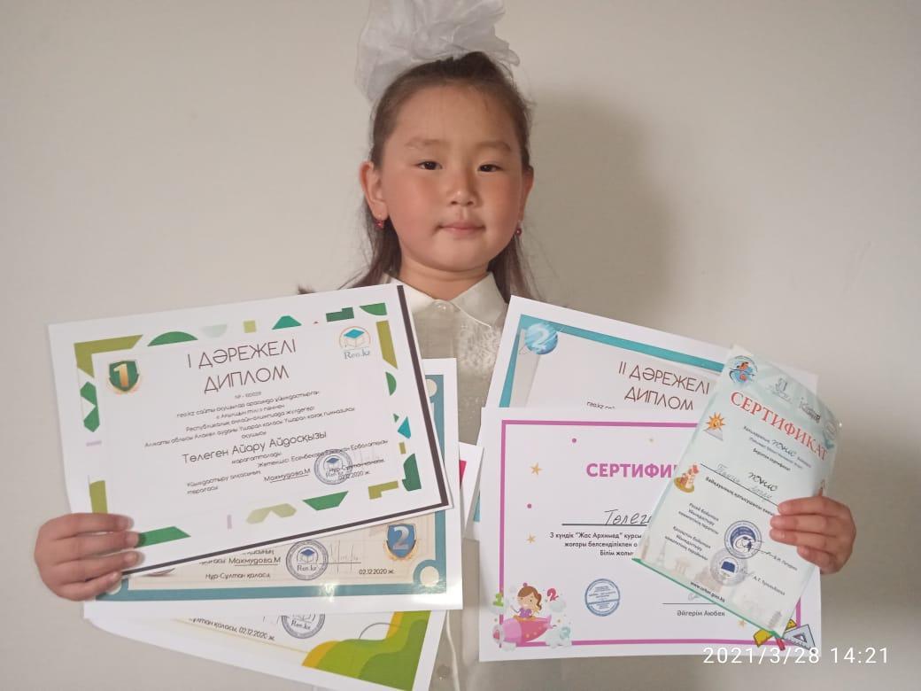 1Б сынып оқушысы Төлеген Айару Айдосқызы. Оқу озаты. Үшарал қазақ гимназиясы мектеп жасына дейінгі шағын орталығы бар мемлекеттік мекемесінің оқушысы. Халықаралық ПОНИ жарысына қатысып, сертификатқа ие болды. Reo.kz онлайн олимпиада сайты жалпы білі